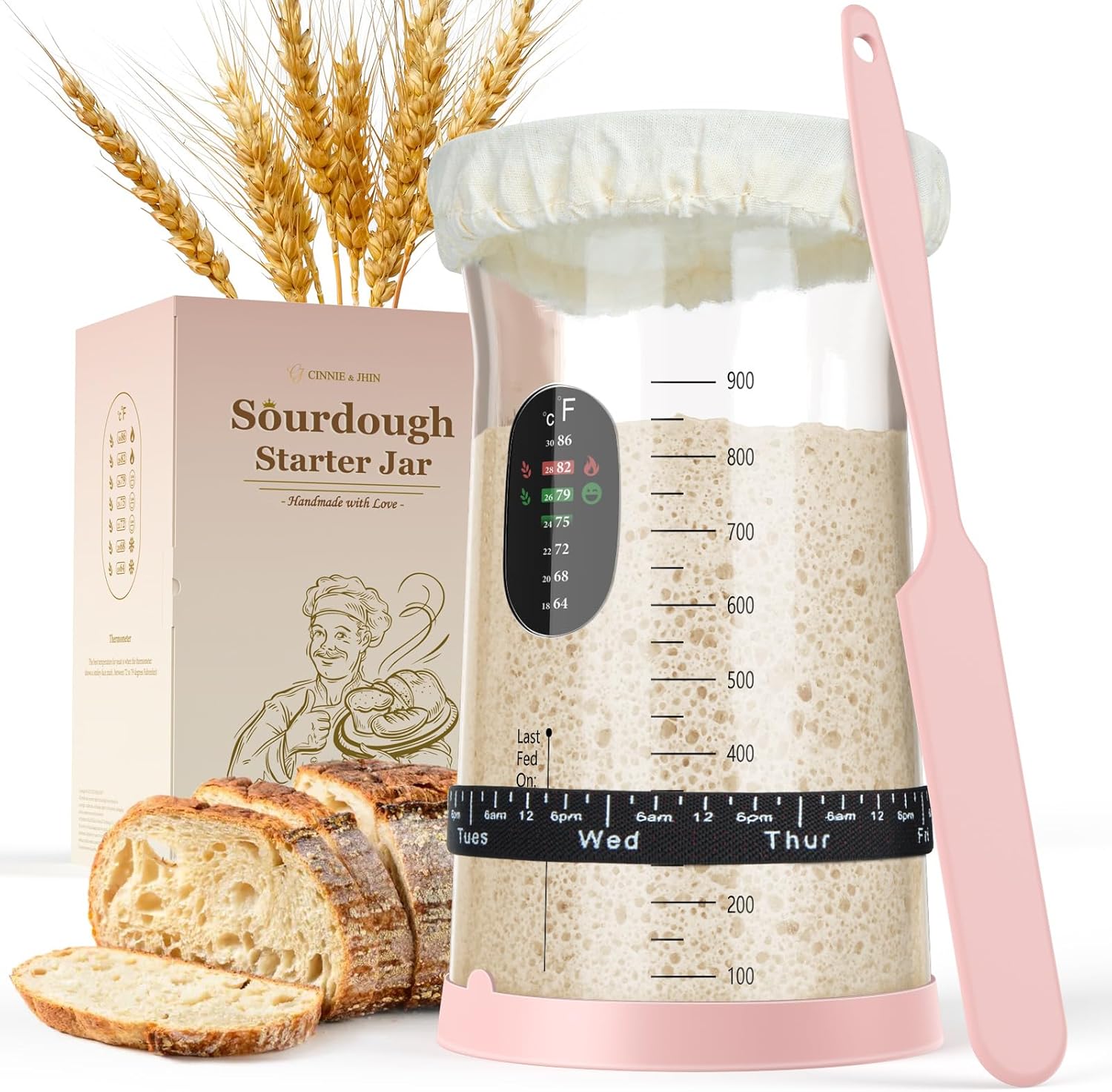 CINNIE&JHIN 34oz Premium Sourdough Starter Jar with Pink Silicone Lid & Spatula – Large Glass Fermenters Jar with Feeding Tracker – Stylish Kitchen Essentials for Home Bakers & Gift Idea for Women