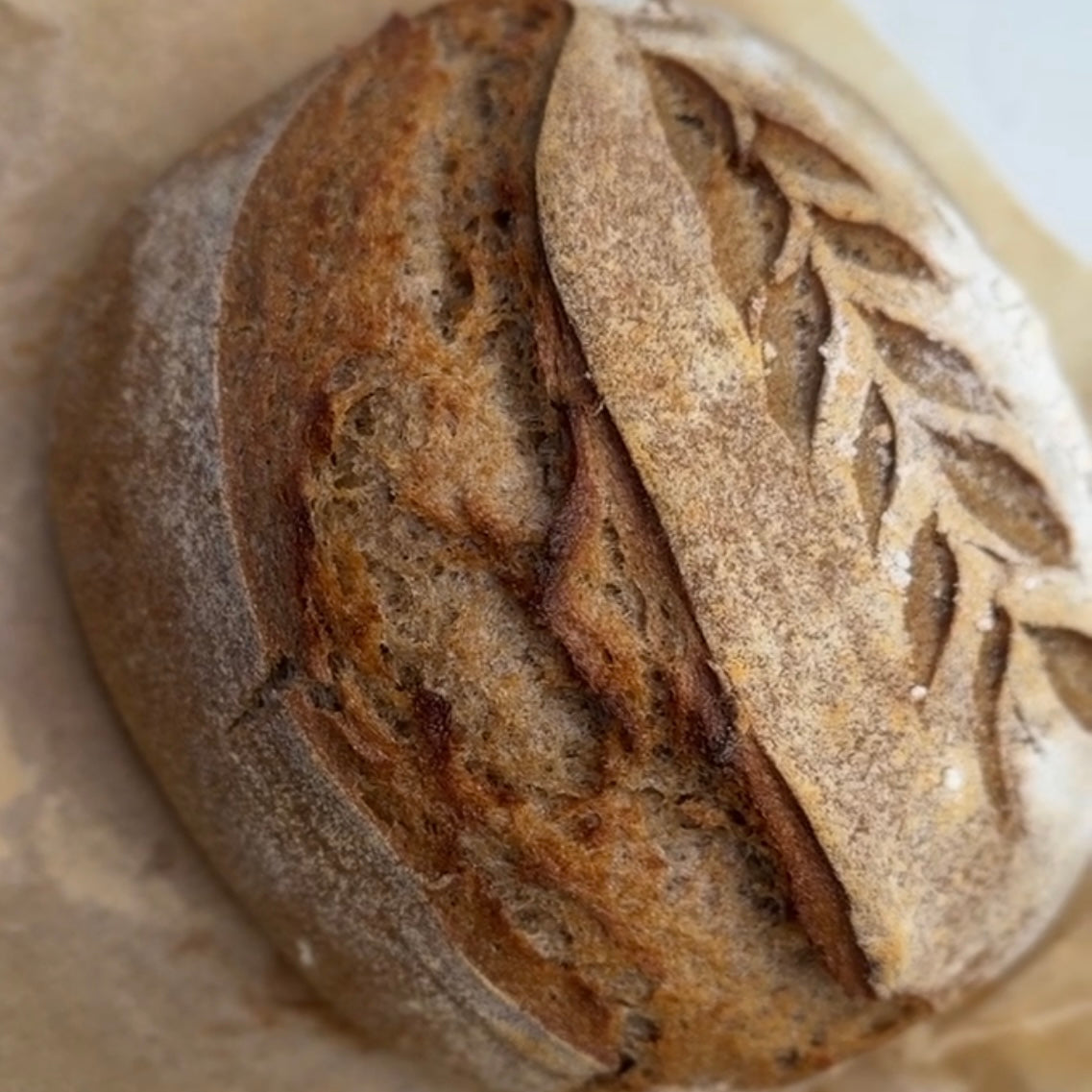 Our Dark Rye Sourdough Tartine is a dense, flavorful loaf weighing approximately 2 lbs. Crafted with a blend of rye flour, whole wheat flour, and our naturally fermented sourdough starter, this bread boasts a rich, earthy taste with a hint of tanginess. Its dark crust and moist, tender crumb make it a standout choice for bold and savory combinations.